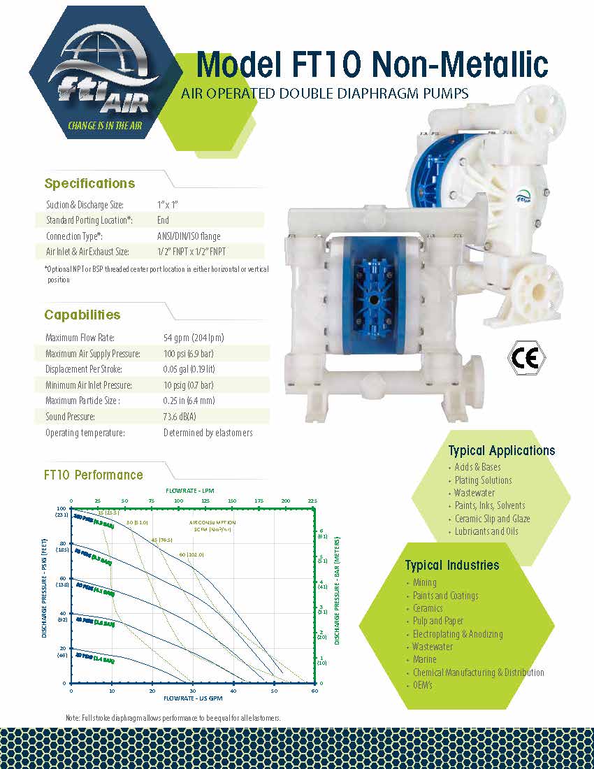 This latest, high performance pump from FTI features 1-inch x 1-inch suction and discharge with ANSI/DIN/ISO flanged end ported connections, a polypropylene center section, polypropylene air valve and valve seats and a choice of diaphragm materials to suit the toughest pumping job.
