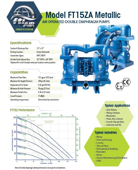 FTI Air FT15ZA air-operated double diaphragm (AODD) aluminum air pumps from Finish Thompson deliver years of dependable performance with a wide range of fluids in a diverse range of metal finishing, seal coating and other pumping applications. This submersible, self-priming pump works in flooded suction, suction lift above the liquid and submerged in the liquid and can handle particles to nearly 0.38″ in size. Runs dry with no trouble at all.